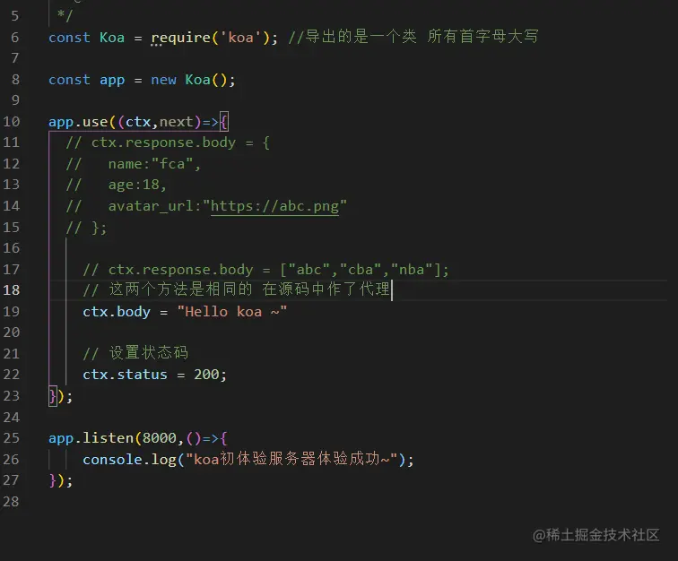 里面的ctx(上下文内容)的ctx.response.body和ctx.body是相同的,在开发当中常用ctx.body 在源码中可以了解到ctx.body是进行的代理的