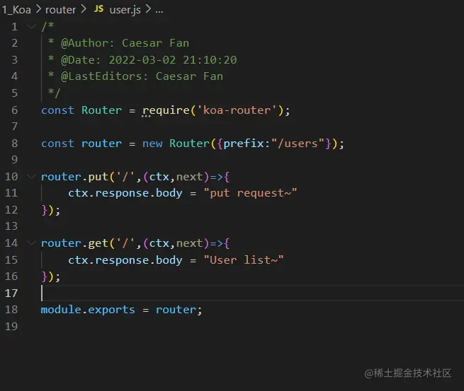 由于koa是一个轻量库 所以想要写接口的话 需要引入router路由的方式,创建一个路由的文件夹 写入对应的接口(prefix指路由的前缀)