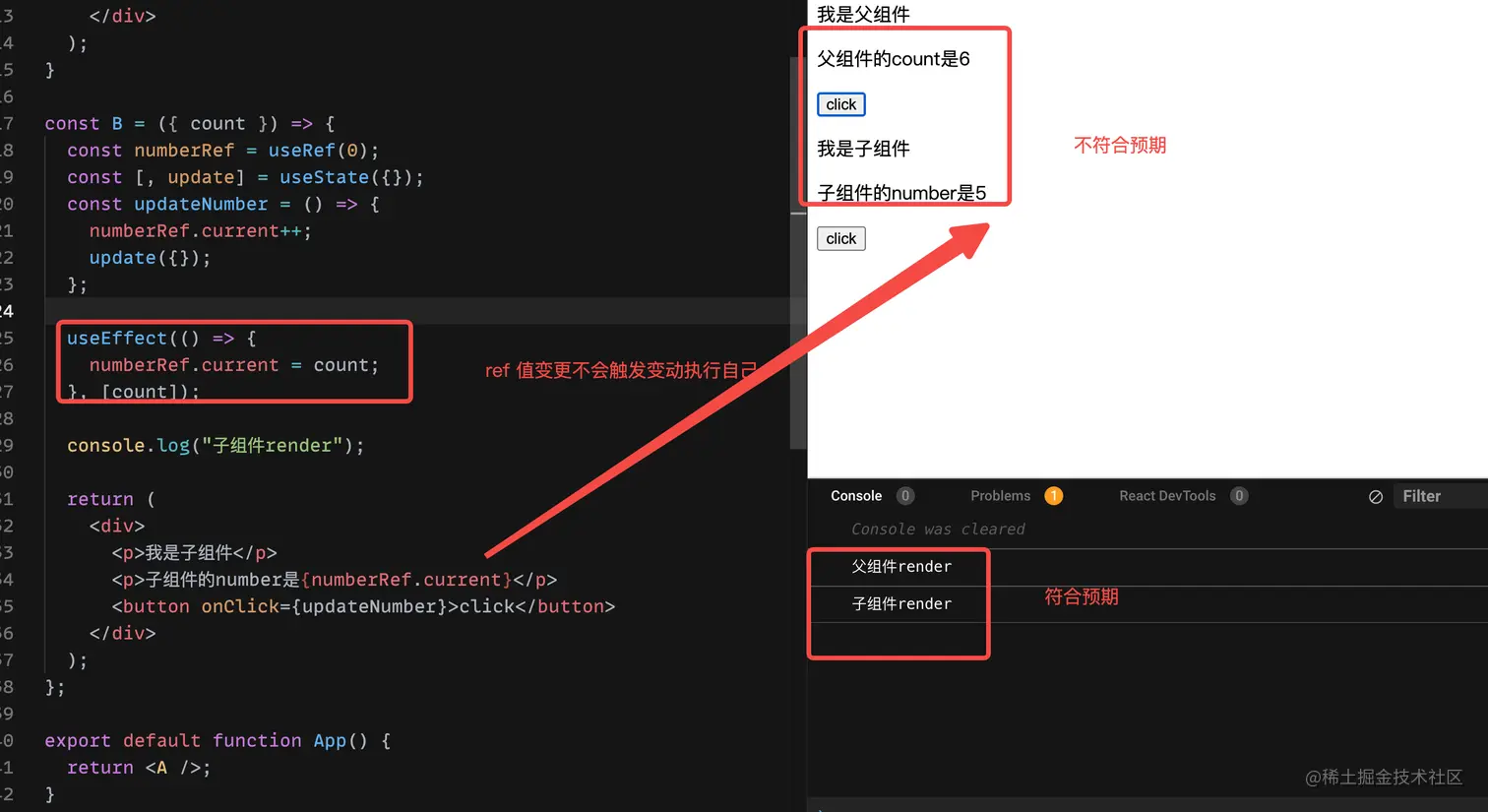 - 直接在 render 里修改 ref 值是不推荐的(虽然问题不大,毕竟大家都这么干),可以关联出另一个新问题,即 juejin.cn/post/710310…
