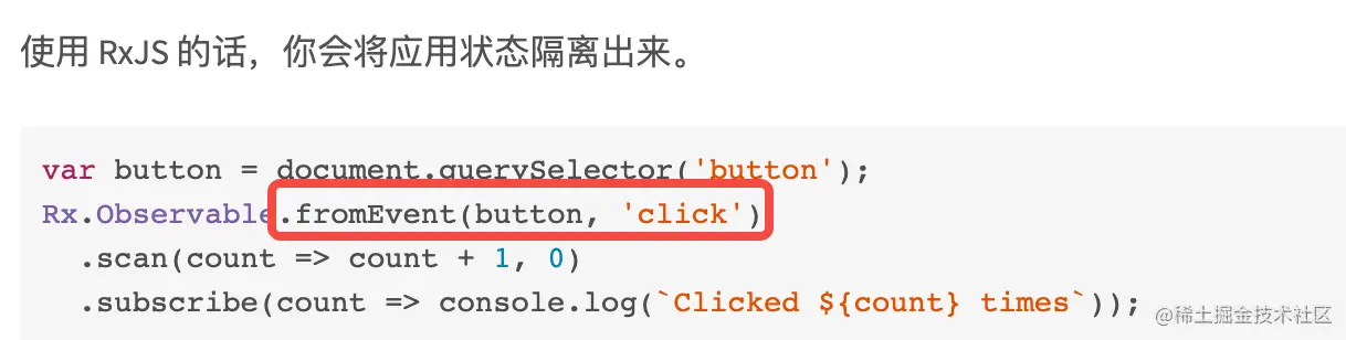 解决:简单来说,比如任何挂dom的事件(理解模型即 Rx 中的事件源,触发数值变化这种副作用的事件:下图中 fromEvent click),只做一件事就是修改数据 (setState ) ,对状态( state )的变化(流)做出的逻辑统一放进 副作用 (类似于Rx 中的操作符,下图中scan subscribe ) 中处理,且应该多多拆分副作用(类似于Rx 拆分流)。