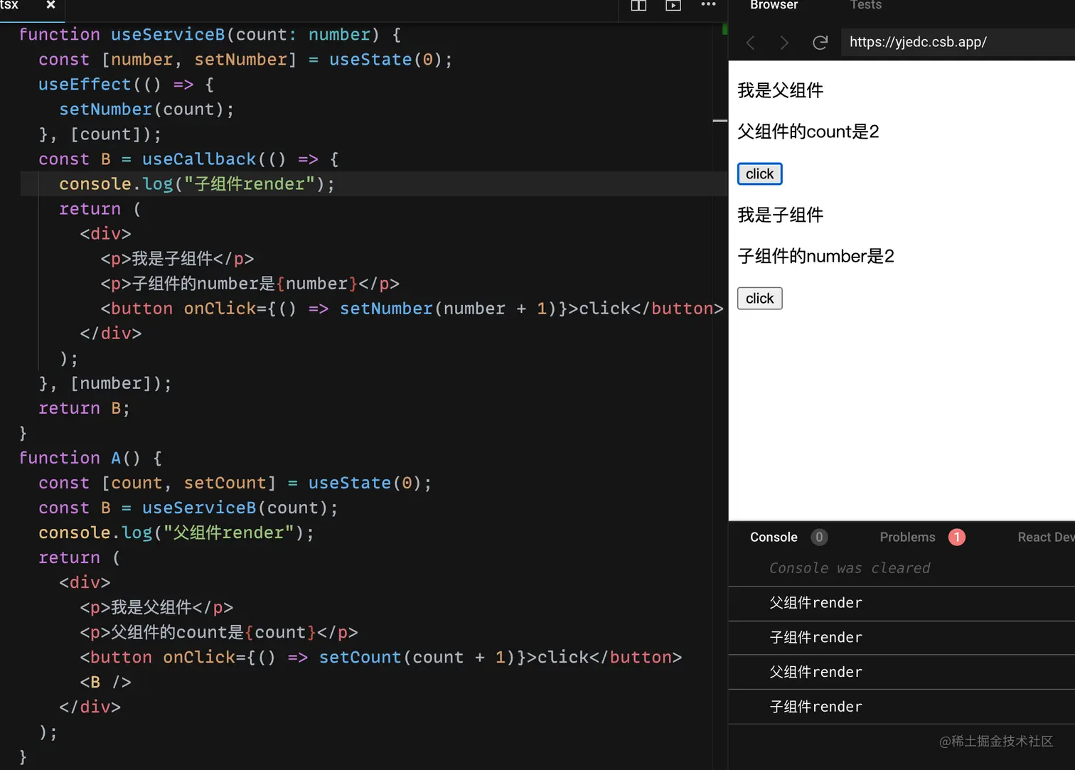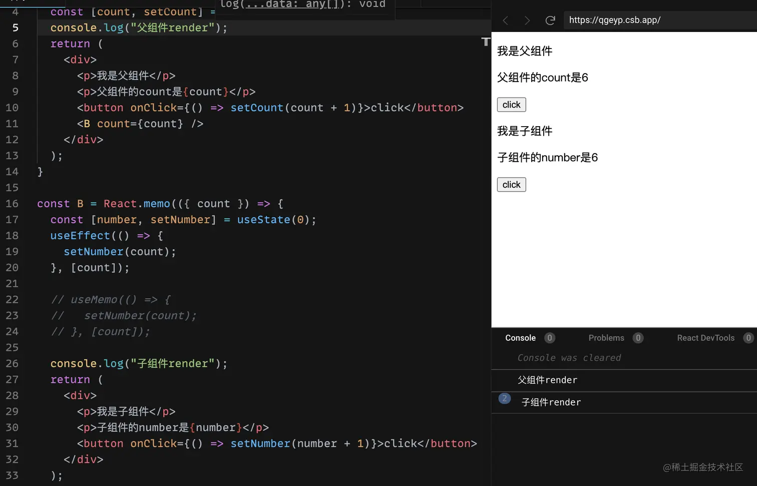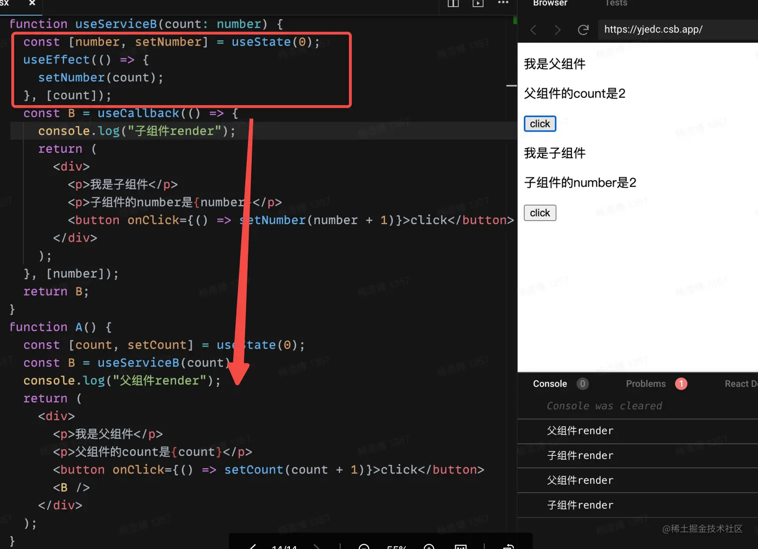 子组件的state要和父组件同步。一个正常的思路都会导致子组件多执行一次:即 count 变化导致 B 执行一次,B 内部的同步又执行了自己一次。下面解法来自知乎回答。