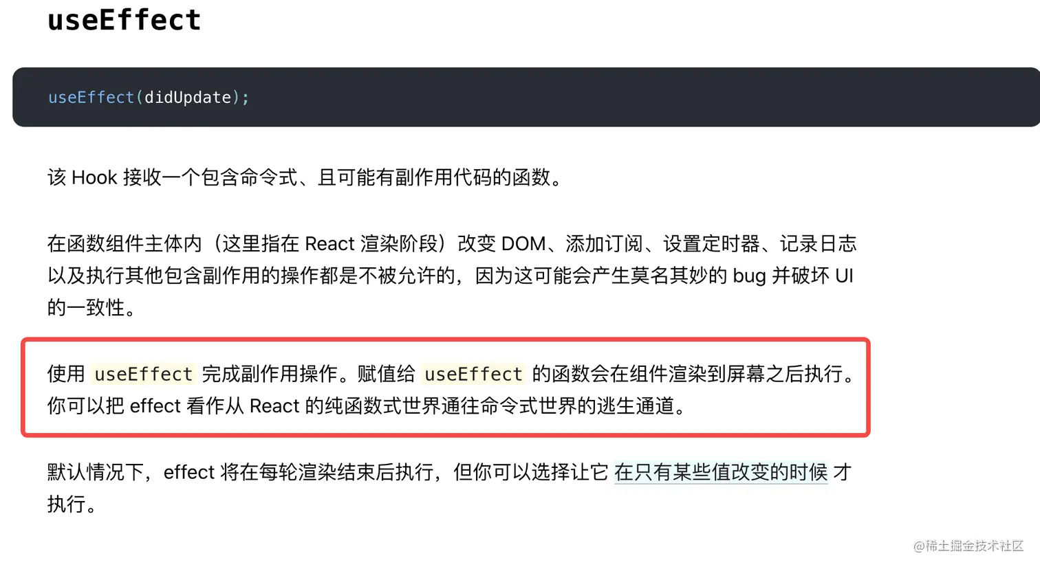 其实这一点对Vue 也是一样 ,函数事件应该只修改 data的值,用watch 处理data的值来处理副作用。 Vue3 直接有 watchEffect 这个api 处理副作用。