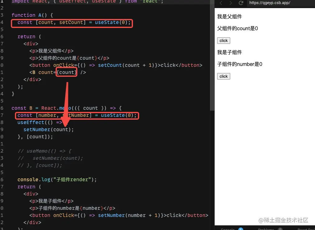当父组件count更新的时候,需要将子组件的number和父组件的count保持同步,但是使用useEffect和useMemo都会让子组件render两次。这里希望子组件只执行一次。