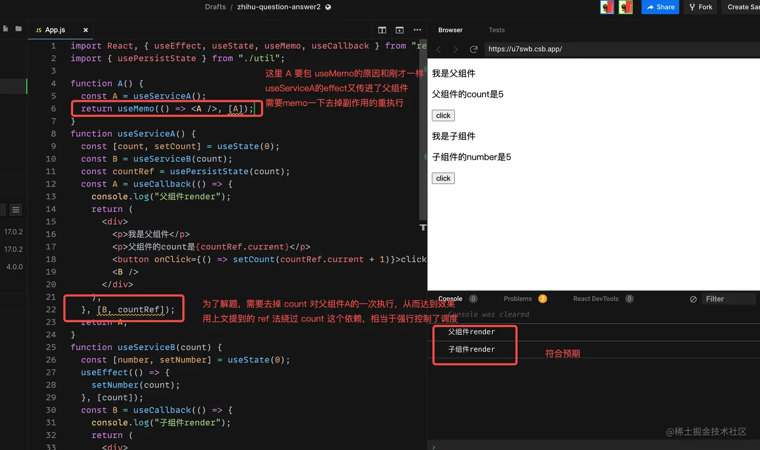 问题1的case。但很多时候想真正解决问题1,我们需要故意给这个useCallBack 少写依赖,依赖如果写全了还是会被预期外的 trigger effect 。这引申到下一个问题的答案:任何时候少写依赖都是绝对错误 的,且一定要遵循 react-hooks 的规则检查。因此 动机2也不成立。