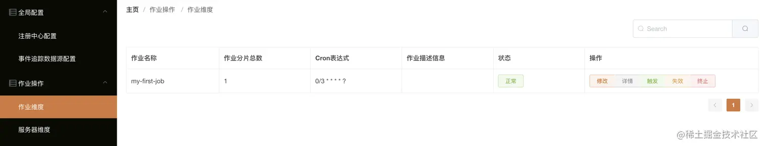 点击作业维度,就可以查看作业的详细信息,包括作业名称、分片总数、cron 表达式等: