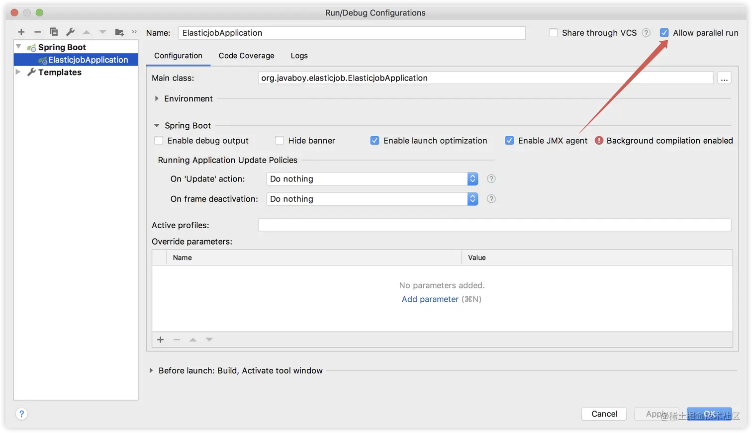 现在我们再次启动一个当前项目的实例,勾选 Allow parallel run 就可以启动多个实例(启动新实例时记得修改端口号):