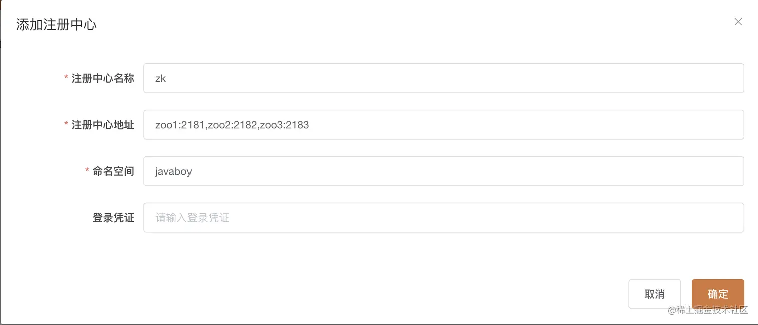 使用 ElasticJob 需要注册中心 zookeeper,这个也好理解,因为 ElasticJob 支持任务在分布式场景下的分片和高可用,所以必然需要一个调度中心,这个 zk 就是调度中心。我这里开启了一个 zk 集群,里边有三个实例,三个 zk 地址之间用 , 隔开。同时我们还要配置一个 namespace,这个 namespace 的作用是防止不同应用的定时任务冲突了,我们给每个应用取一个不同于其他应用的 namespace,这样就不用担心冲突了。