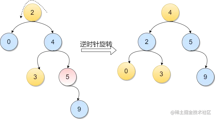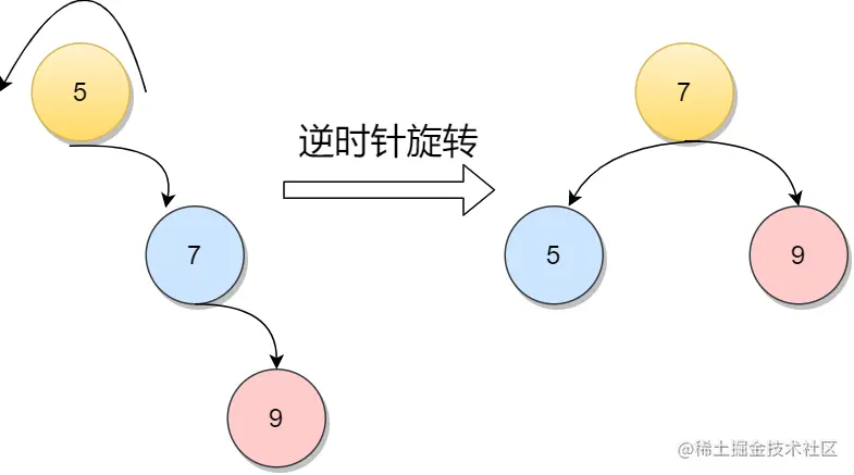 如下图,因为在元素5的右孩子的右孩子插入新的节点,导致元素5的平衡因子从-1变为-2,不在满足根本性质[-1,1],所以需要通过旋转。显然,按照大小关系,结点元素7应作为新的根结点,其余两个节点分别作为左右孩子节点才能平衡,这样看来,仿佛节点元素5绕结点元素7逆时针旋转一样。
