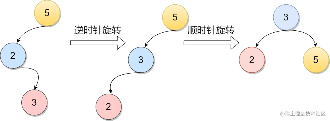 下图中,当在节点5的左子树中插入节点的时候而导致不平衡。这种情况调整如下:首先将元素5的左孩子2提升为新的根结点;然后将原来的根结点元素5降为元素2的右孩子;其他各子树按大小关系连接。
