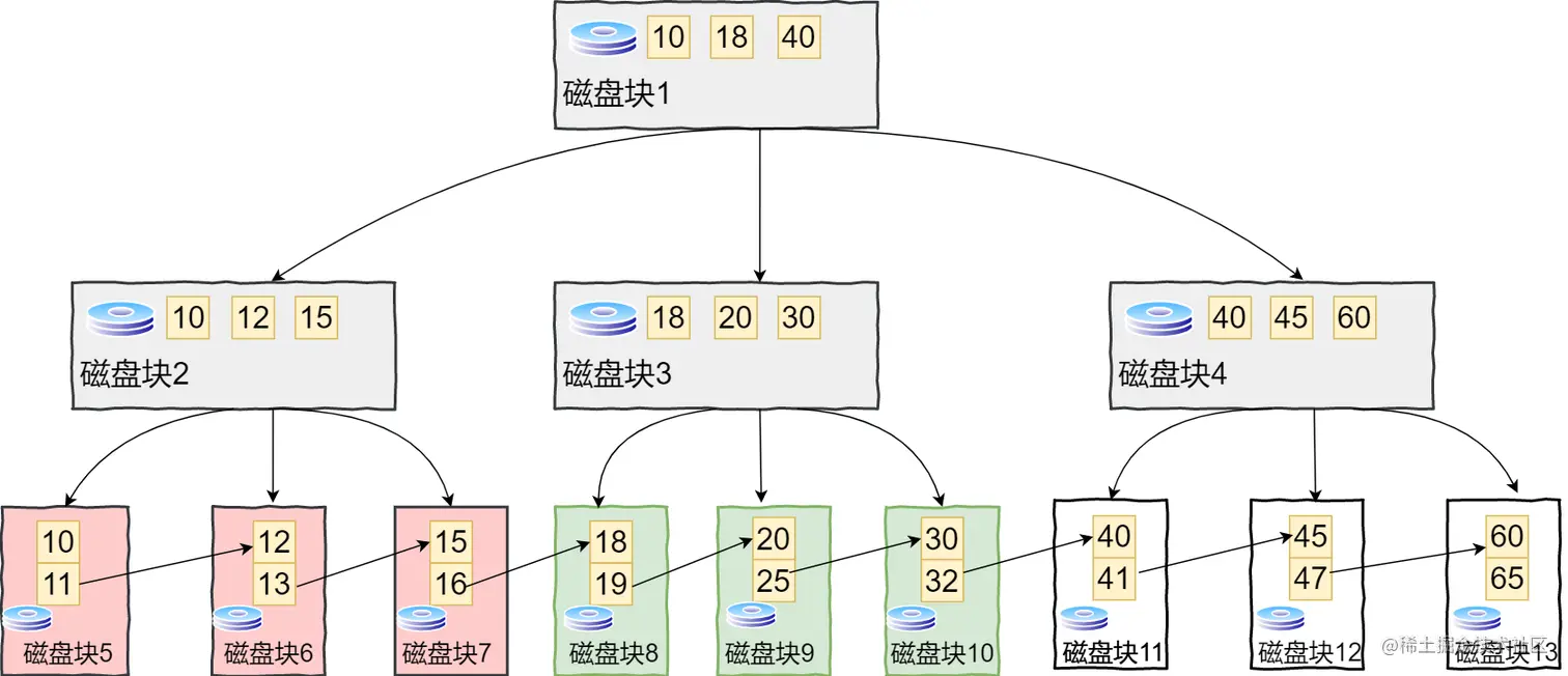 - 磁盘2中的关键字为(10,12,15),这时15大于13,所有磁盘6