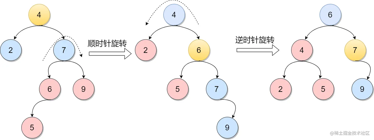 由于节点元素6增加一个左孩子,导致元素4变得不平衡。先顺时针旋转元素7再逆时针旋转4元素达到平衡。
