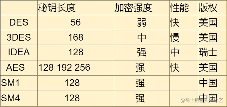 之前几种都是国外的,我们国内自行研究了国密 SM1和SM4。其中S都属于国家标准,算法公开。优点就是国家的大力支持和认可