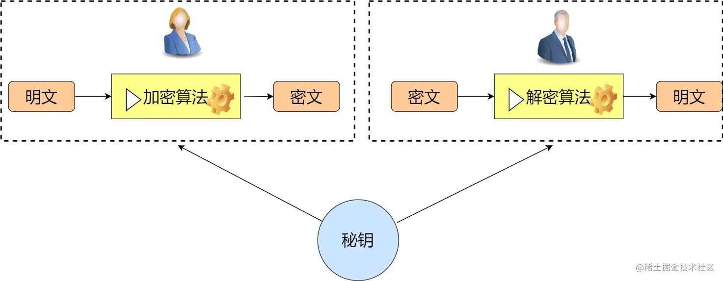 对称加密,顾名思义,加密方与解密方使用同一钥匙(秘钥)。具体一些就是,发送方通过使用相应的加密算法和秘钥,对将要发送的信息进行加密;对于接收方而言,使用解密算法和相同的秘钥解锁信息,从而有能力阅读信息。