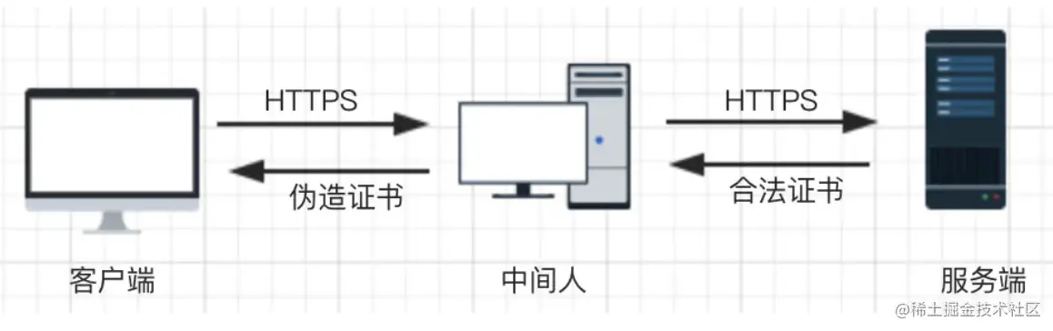 简单来说,中间人攻击中,中间人首先伪装成服务端和客户端通信,然后又伪装成客户端和服务端进行通信(如图)。 整个过程中,由于缺少了证书的验证过程,虽然使用了https,但是传输的数据已经被监听,客户端却无法得知