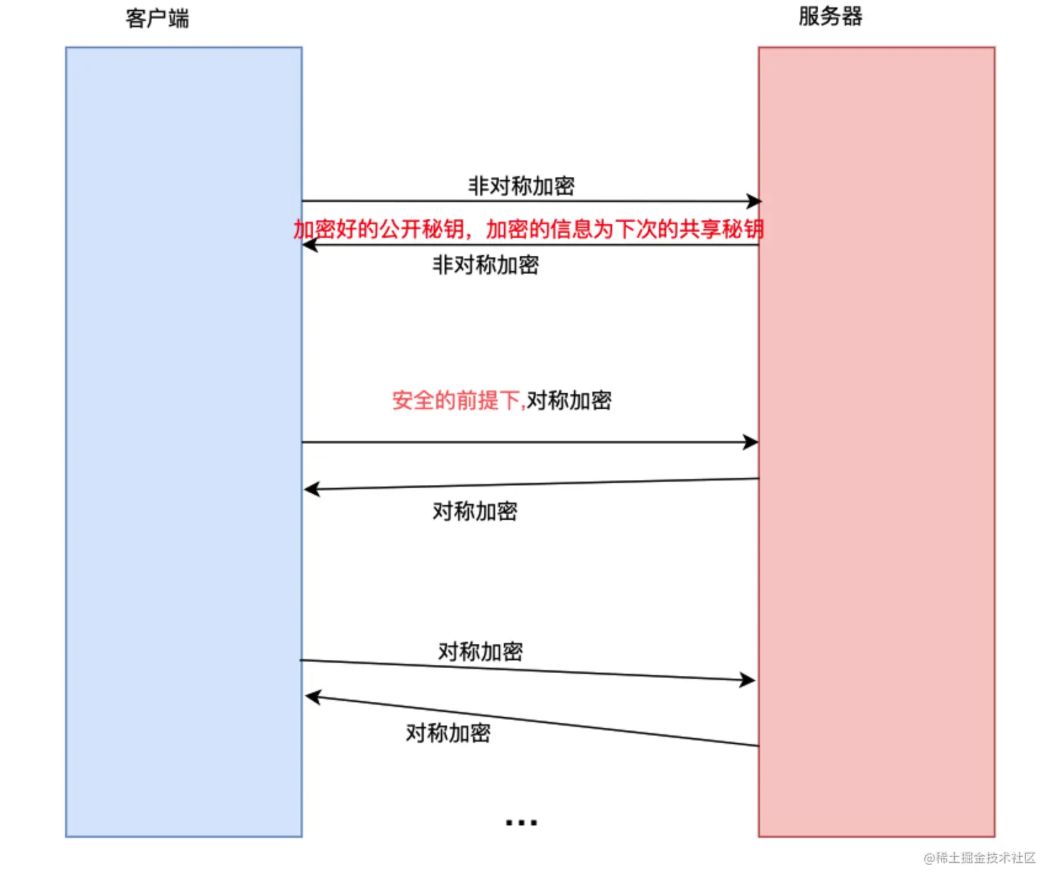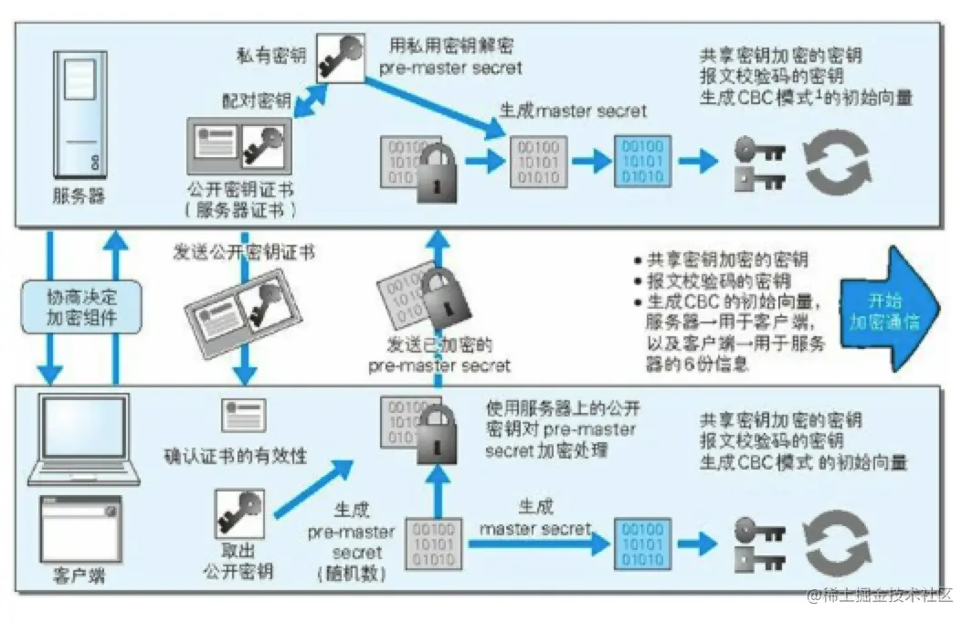 - 服务端通过私钥对随机数进行解密。 服务端通过客户端传入的随机数构造对称加密算法,之后的数据交互通过对称加密算法进行加解密。(对称加密(也叫私钥加密)指加密和解密使用相同密钥的加密算法)