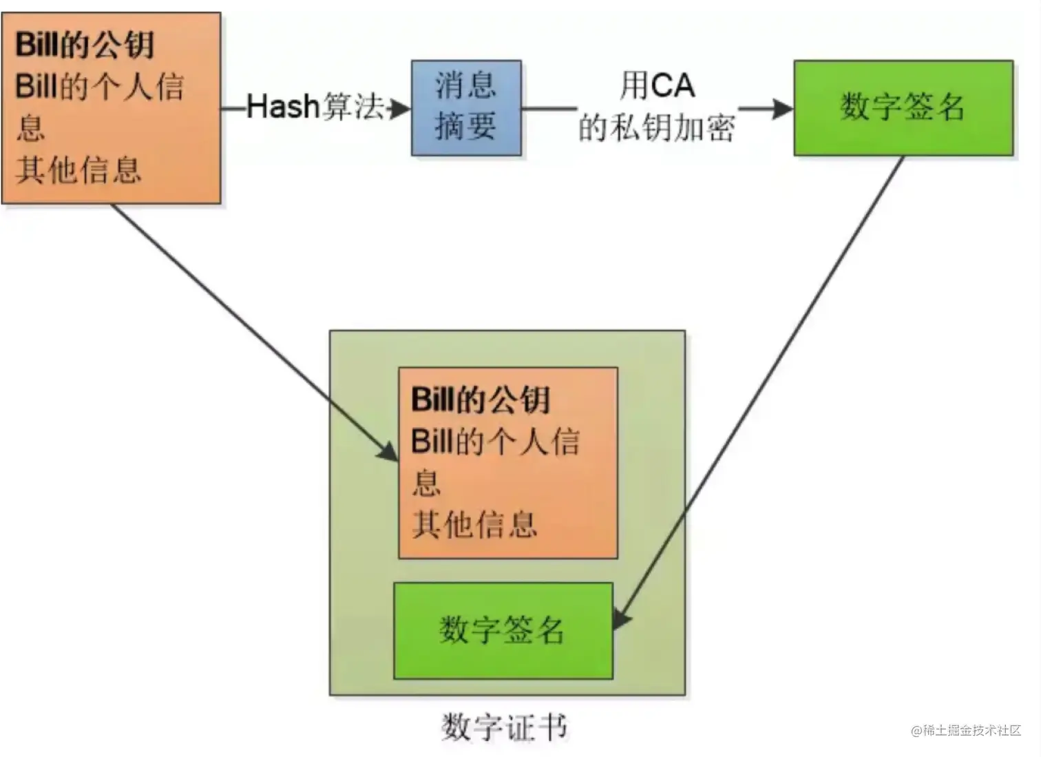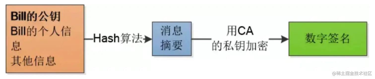 - 在确认其真实性后,认证机构给这些信息(申请者的公钥,组织信息,个人信息以及认证机构自己的信息等),我们简称为明文信息,进行数字签名,过程也就是签名提到的数字签名的步骤:1.通过Hash函数处理明文信息生成一个信息摘要;2.再用认证机构自己的私钥对信息摘要进行加密处理。通过这两个步骤生成的文件就叫数字签名。