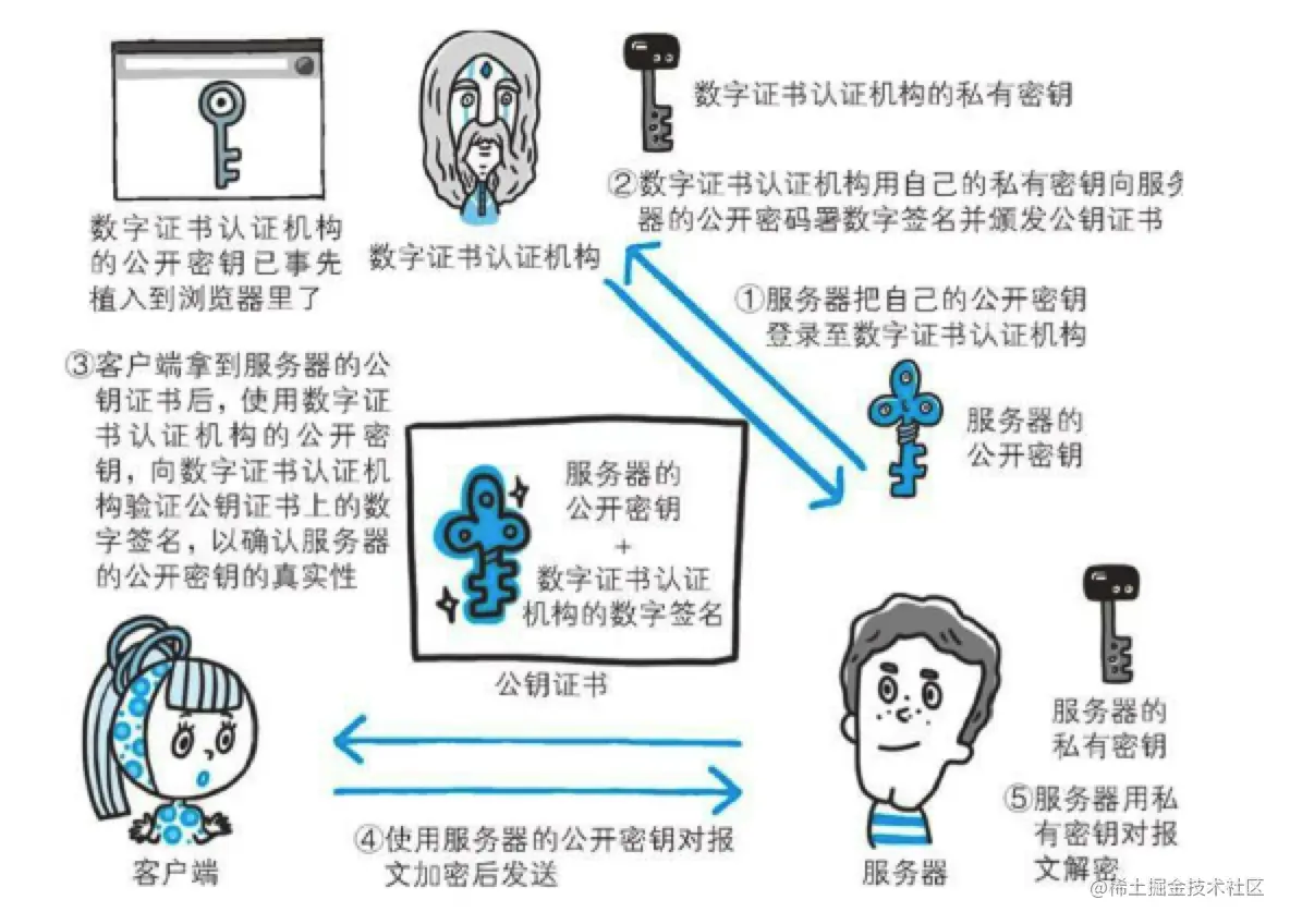 它简单来说其实是由一些权威的数字认证机构颁发给服务器的一个文件。数字认证机构简称CA,它是客户端和服务端都信任的第三方机构。至于颁发证书的流程,主要是为: