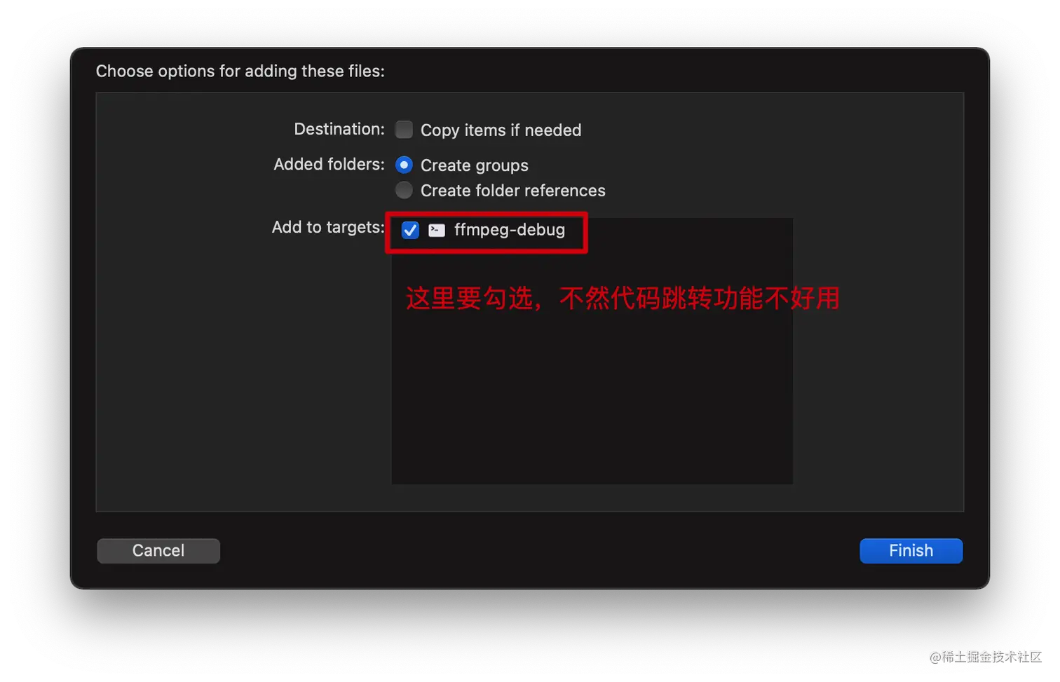 把 ffmpeg 目录拖进工程,等待添加完成,可能时间较久