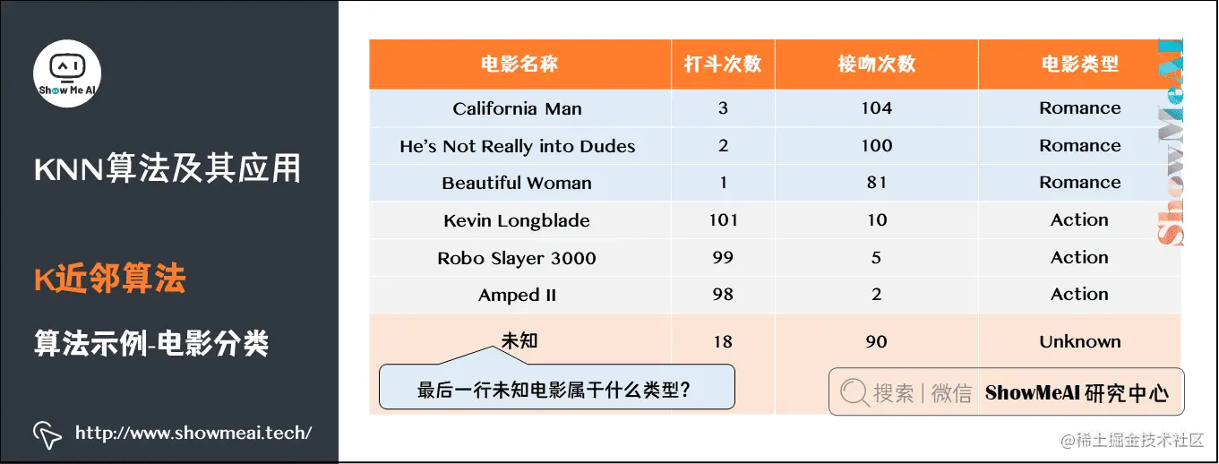 这里假定将电影分为爱情片和动作片两类,如果一部电影中接吻镜头很多,打斗镜头较少,显然是属于爱情片,反之为动作片。