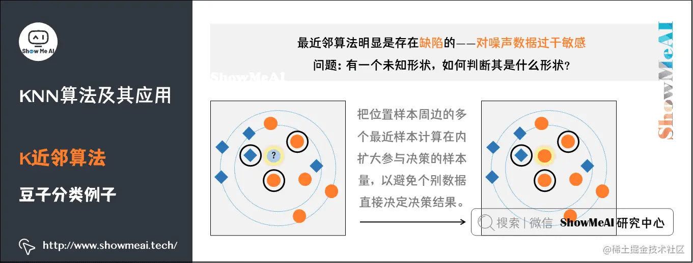 为了解决这个问题,我们可以把位置样本周边的多个最近样本计算在内,扩大参与决策的样本量,以避免个别数据直接决定决策结果。