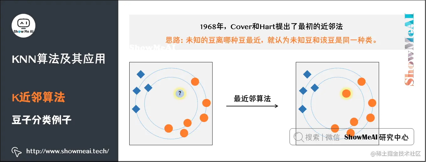 1968年,Cover和Hart提出了最初的近邻法,思路是——未知的豆离哪种豆最近,就认为未知豆和该豆是同一种类。