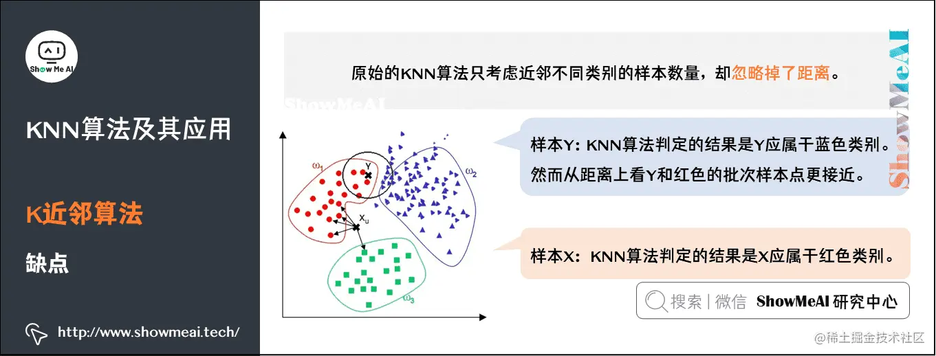 观察下面的例子,我们看到,对于样本X,通过KNN算法,我们显然可以得到X应属于红色类别。但对于样本Y,KNN算法判定的结果是Y应属于蓝色类别,然而从距离上看Y和红色的批次样本点更接近。因此,原始的KNN算法只考虑近邻不同类别的样本数量,而忽略掉了距离。