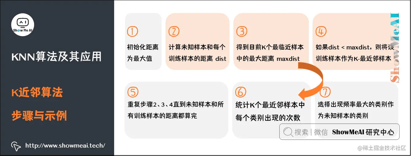 说明:KNN没有显示的训练过程,它是「懒惰学习」的代表,它在训练阶段只是把数据保存下来,训练时间开销为0,等收到测试样本后进行处理。