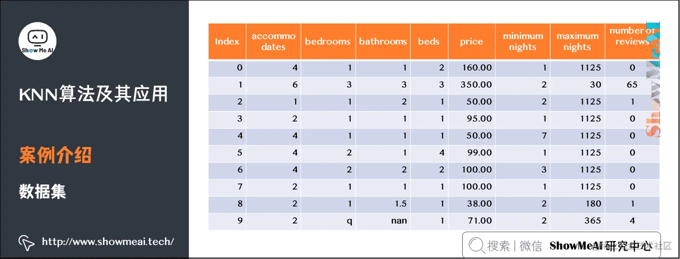 假如一套房子打算出租,但不知道市场价格,可以根据房子的规格(面积、房间数量、厕所数量、容纳人数等),在已有数据集中查找相似(K近邻)规格的房子价格,看别人的相同或相似户型租了多少钱。