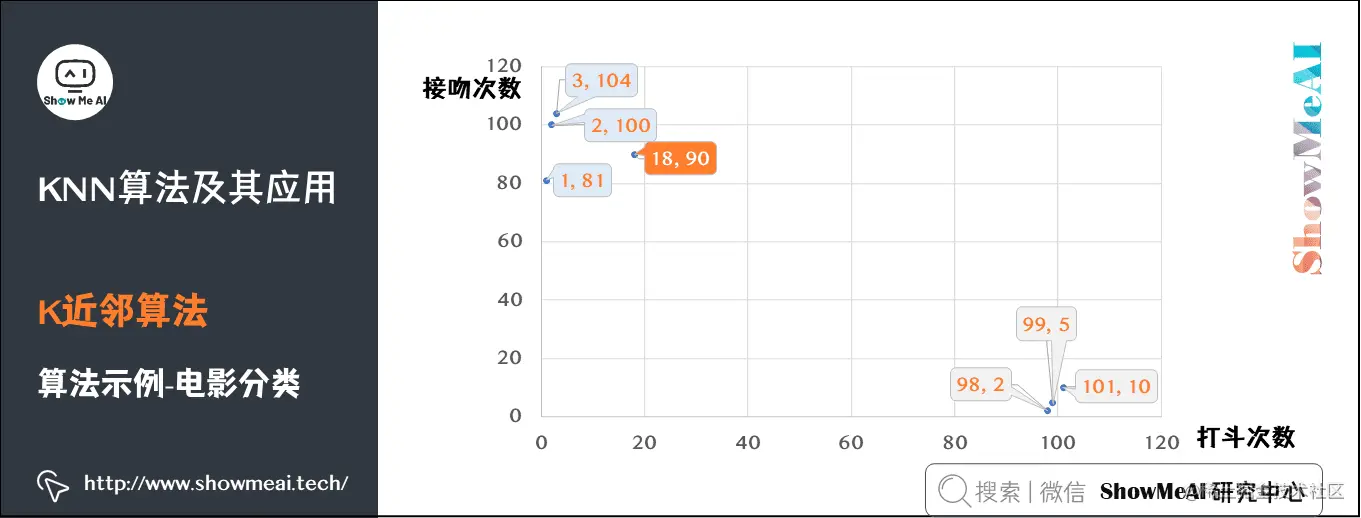 有人曾根据电影中打斗动作和接吻动作数量进行评估,数据如图。给定一部电影数据(18,90)打斗镜头18个,接吻镜头90个,如何知道它是什么类型的呢?