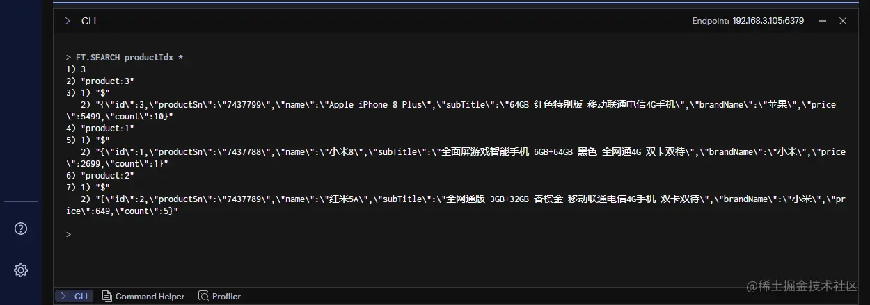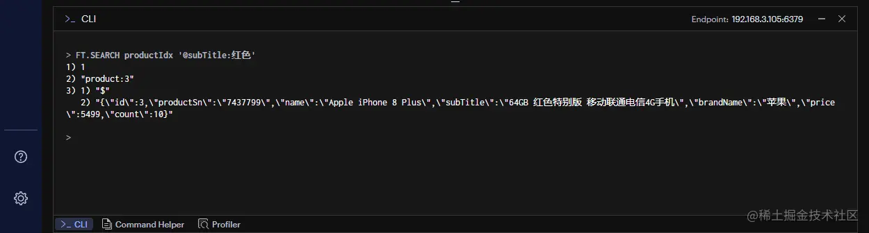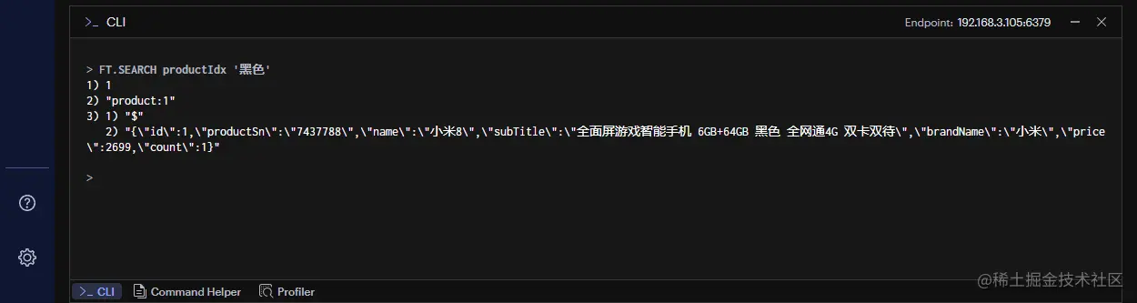 FT.SEARCH中直接指定搜索关键词,可以对所有TEXT类型的属性进行全局搜索,支持中文搜索,比如我们搜索下包含黑色字段的商品;
