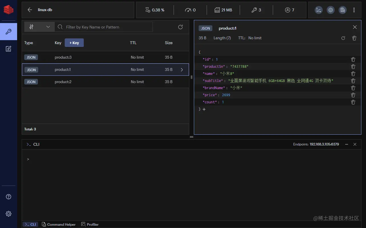 - 数据插入成功后,在RedisInsight中将看到如下信息,JSON数据支持格式化高亮显示;