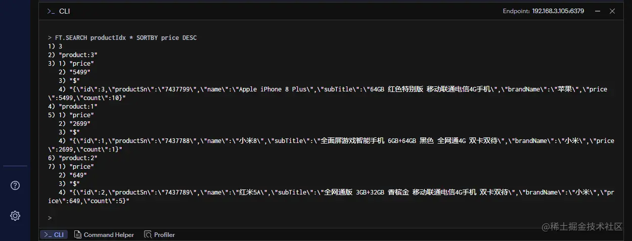 price字段为SORTABLE,我们可以以price降序返回商品信息;
