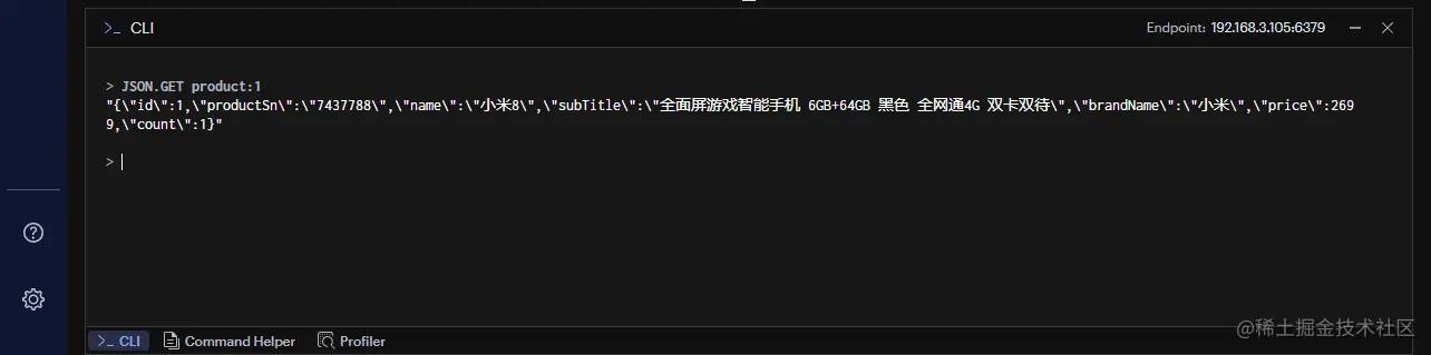 JSON.SET product:1 $ '{"id":1,"productSn":"7437788","name":"小米8","subTitle":"全面屏游戏智能手机 6GB+64GB 黑色 全网通4G 双卡双待","brandName":"小米","price":2699,"count":1}'