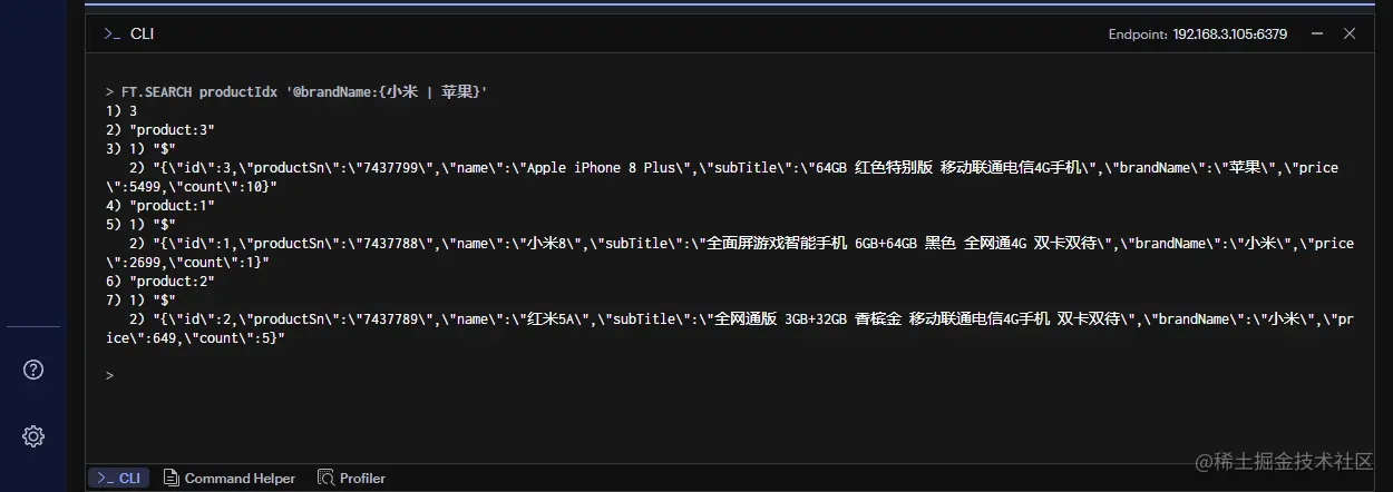 FT.SEARCH productIdx '@brandName:{小米 | 苹果}'