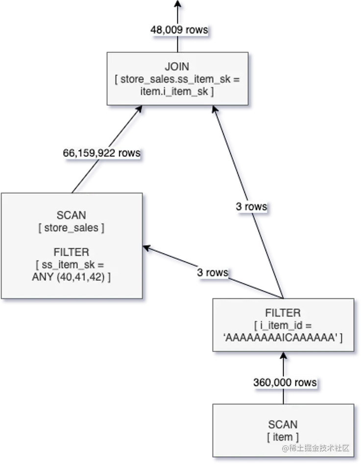 从上图可以看出,先对store_sales进行全表扫描,然后再和过滤后的item表的行进行join,虽然结果仅有4万多条数据,但却扫描了表store_sales中的80多亿条数据。针对该查询,很直观的优化是:先查询出表item中i_item_id = 'AAAAAAAAICAAAAAA'数据行,然后将这些数据行的i_item_sk值作为表store_sales的ss_item_sk的查询条件在表store_sales的SCAN阶段进行过滤,结合我们在上面介绍的Data Skipping技术,可以大幅减少表文件的扫描。这一思路正是DFP的根本原理,启动DFP后的逻辑执行计划如下图所示: