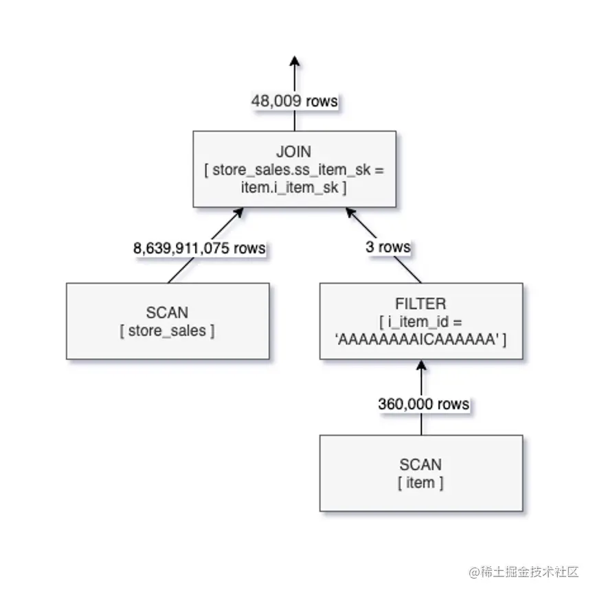 在该查询中,item为维表(数据量很少),store_sales为事实表(数据量非常大),where查询条件作用于维表上。如果不开启DFP,那么该查询的逻辑执行计划如下: