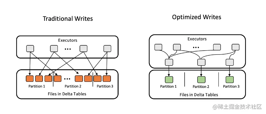 在开源版Spark中,每个executor向partition中写入数据时,都会创建一个表文件进行写入,最终会导致一个partition中产生很多的小文件。Databricks对Delta表的写入过程进行了优化,对每个partition,使用一个专门的executor合并其他executor对该partition的写入,从而避免了小文件的产生。