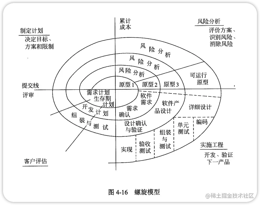一个原型往往达不到要求,为了减少开发风险,在瀑布模型和原型化模型的基础上,由演进出现了螺旋模型和RUP。