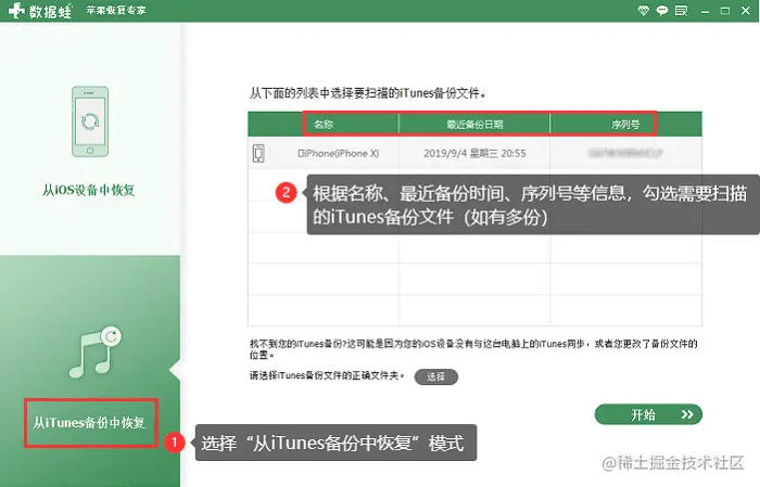 步骤2. 确认以上问题后,在电脑上安装数据蛙苹果恢复专家,之后点击选择“从iTunes备份中恢复”这个模式,软件会自动检测到电脑上所有的iTunes备份文件,此时您可以勾选需要扫描的iTunes备份文件,然后点击“开始”。
