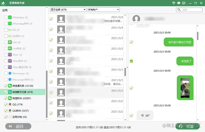 步骤二: 扫描成功后(该扫描环节时长时慢,视数据大小而定),在左侧的应用栏拉到最底部,勾选“微信聊天记录”,画面就会显示出跟每位好友的聊天记录,从中选取需要恢复的那个好友的聊天记录后,点击右下角的“恢复”即可。