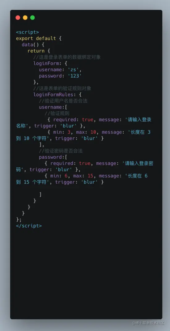 data中定义这个校验对象rules:{}每个属性都是验证规则 -