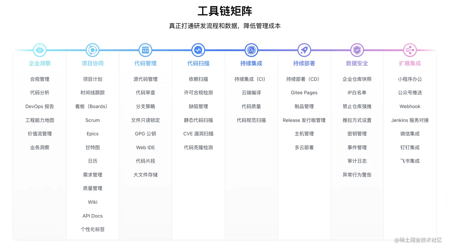 传统企业的信息化转型并非一蹴而就。 Gitee作为全流程覆盖的DevOps 研发管理平台,除代码管理外也拥有全面的工具链矩阵。中铁二十三局信息化团队就以代码管理为入口,以工作中最基础的管理出发,逐步向更高效的 DevOps 领域扩展,循序渐进地实现信息化转型。
