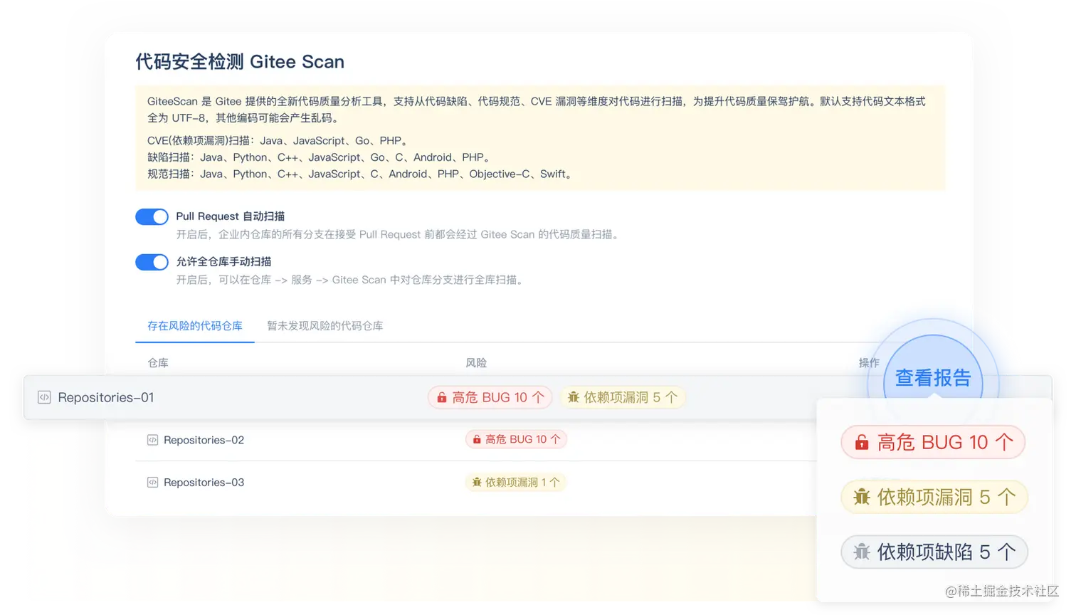 为了追求更高的代码质量,信息化团队采用了 Gitee 企业版的代码质量分析工具 Gitee Scan ,能够帮助开发团队快速定位问题,提高团队代码评审的效率,进一步提高代码质量。
