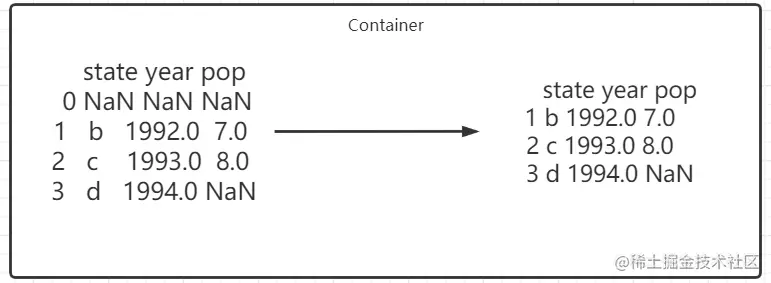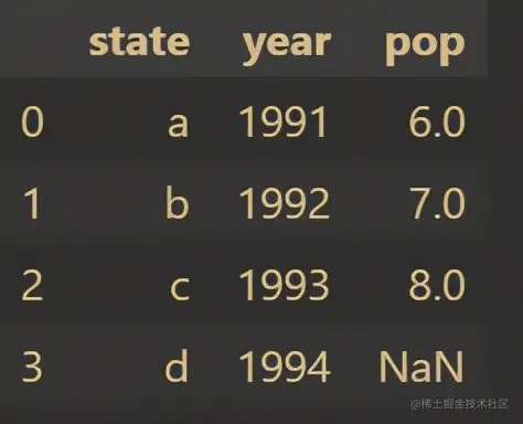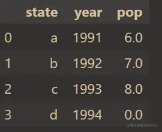 df = pd.DataFrame({'state':['a','b','c','d'],'year':[1991,1992,1993,1994],'pop':[6.0,7.0,8.0,np.NaN]})