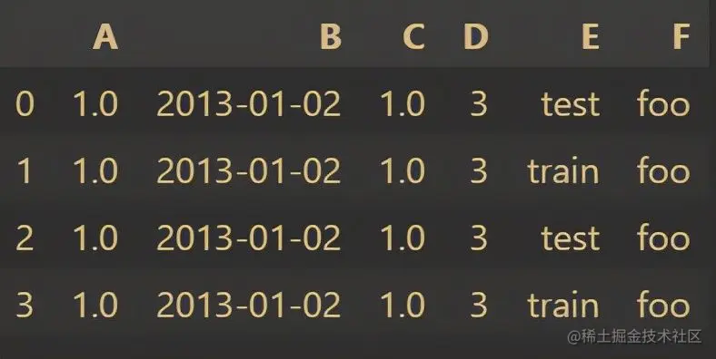 df2 = pd.DataFrame( { "A": 1.0, "B": pd.Timestamp("20130102"), "C": pd.Series(1, index=list(range(4)), dtype="float32"), "D": np.array([3] * 4, dtype="int32"), "E": pd.Categorical(["test", "train", "test", "train"]), "F": "foo", })