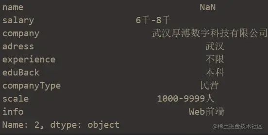 dic = {'name':'前端开发','salary':2万-2.5万, 'company':'上海科技有限公司', 'adress':'上海','eduBack':'本科','companyType':'民营', 'scale':1000-10000人,'info':'小程序'}