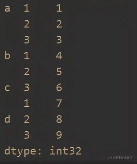 s = pd.Series(np.arange(1,10),index=[list('aaabbccdd'),[1,2,3,1,2,3,1,2,3]])