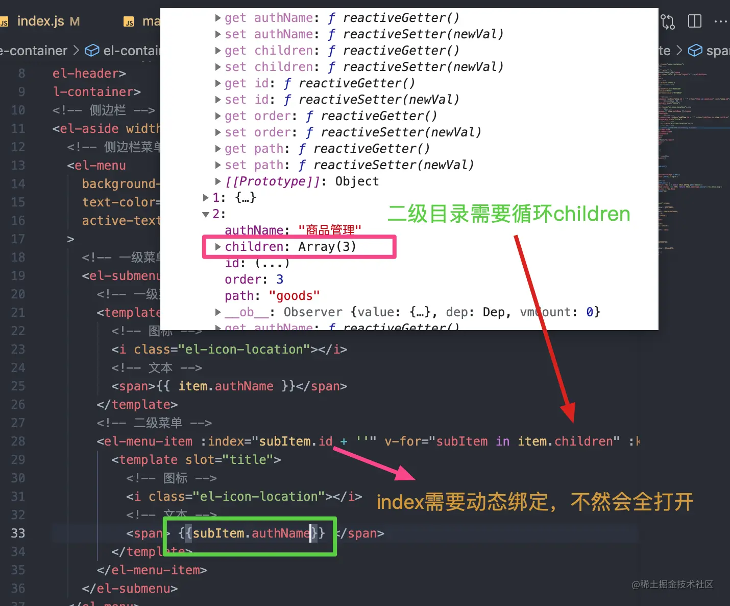 key需要指定,一般为idv-for渲染一级目录渲染二级目录