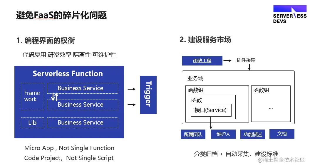 二是:FaaS 的碎片化问题。传统 Serverful 应用的构建思路是非常高内聚的,某个业务的核心能力基本都聚合在几个微服务应用中,数量相对较少。但是函数不同,它轻量化的特点会导致数量膨胀非常快,如果不加以设计和控制,那么很容易出现一个业务背后对应着几十个函数的碎片化情景出现。