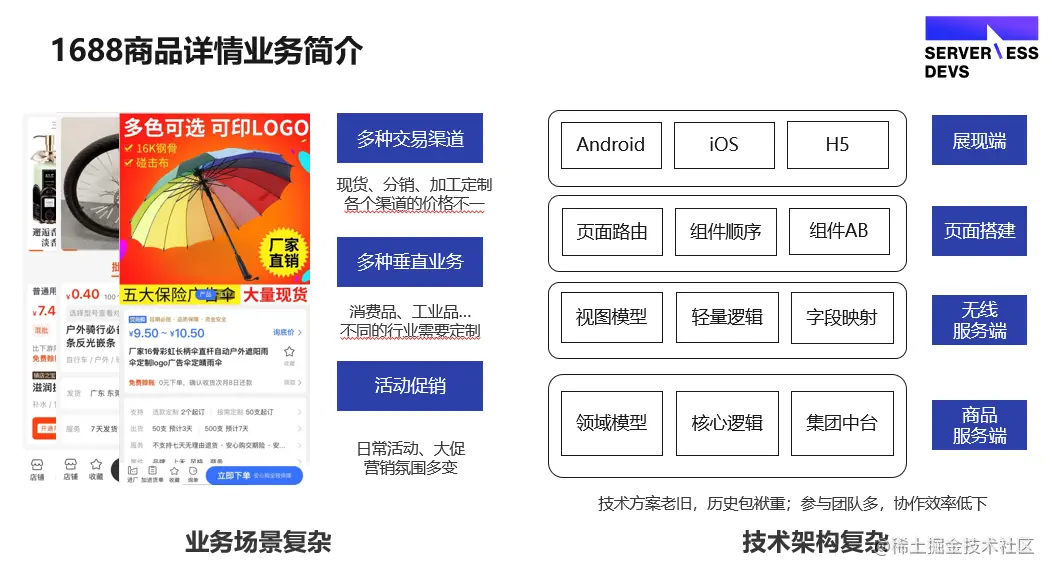 这里先简单介绍一下 1688 的商品详情业务场景:商品详情就是商品面向买家的最终展示页面,承载了大量的商品信息。1688 的商品详情页和其他普通 C 类电商不一样的地方在于:面向 B 类的交易会存在多种交易渠道,例如现货批发 、分销铺货、加工定制等等,其中每个渠道的交易方式、价格、库存逻辑都不一样;除此之外 B 类电商对于消费品、工业品等不同行业的商品,在表达上也会存在巨大差异;不同渠道和行业定制,再叠加各类电商营销活动玩法,使得 1688 的商品详情页面业务复杂度非常之高。